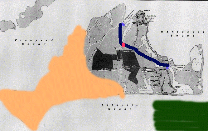 The red dot sitting on the chartreuse line marks the famous intersection. Barnes is the road that goes through it north–south. The unmarked road approaching from the north is the Edgartown–Vineyard Haven Road, which we think of as an east–west road (for reasons that will become clearer in the next map). The rose dot slightly left of center is where I have lived since March 1, 2007. The chartreuse line marks one of the two routes that I usually take to Oak Bluffs, where I buy all of my liquor and most of my groceries. Notice that this route takes me through the intersection south to north or north to south.