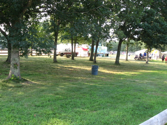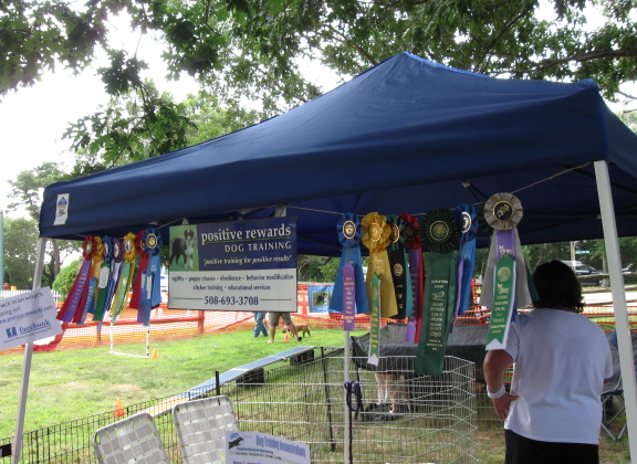 This is the third year that Trav and I have helped our instructor, Karen Ogden, with the Positive Rewards “booth” at the fair. (Trav is only three and a half; like many fairgoers, he started young.) This year we started setting up on Saturday evening, delineating our performance and chill-out areas with stakes, snow fencing, and lots of zip ties. Plenty remained to be done on Sunday morning, so we gathered at 7 and got to work erecting the little tent, hanging signs, and (big one) setting up the agility equipment. Agility equipment is bulky and heavy and includes myriad pieces of PVC pipe that fit together to form jumps and other obstacles. There is a reason that Karen not only drives around in a big Tacoma pickup but also hauls a good-sized utility trailer.