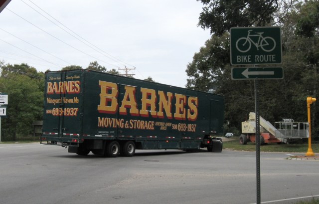 Trip and crew then went into Vineyard Haven. He’d earlier ascertained that the little circle near the SSA (Steamship Authority) terminal, the one where the VTA (Vineyard Transit Authority) and Park & Ride buses stop to let off and pick up passengers, was about the size of the proposed roundabout. Proponents assure us that big trucks, like the 62-footers that deliver groceries to the Stop & Shop in Edgartown, will have no trouble negotiating the roundabout. Many truckers have misgivings about this. I hear Trip and truck had to go up on the curb to get around the circle, but I’m sorry to say I missed the photo op: I was back at Tilton’s kibitzing with my colleagues.