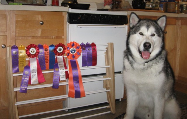 Here’s Travvy — that’s Masasyu’s Fellow Traveller, RL2, RA, CGC — with his loot from this weekend. Someday I will blog more about our journey together and why I believe that clicker training could even fix the U.S. Congress, but for the moment let it suffice to say that when Travvy says he works very hard, he’s not kidding. The big ribbon is for finishing our Level 2 title (RL2) in APDT Rally Obedience. APDT = the Association of Pet Dog Trainers. Our trainer is Karen Ogden of Positive Rewards Dog Training, Vineyard Haven.