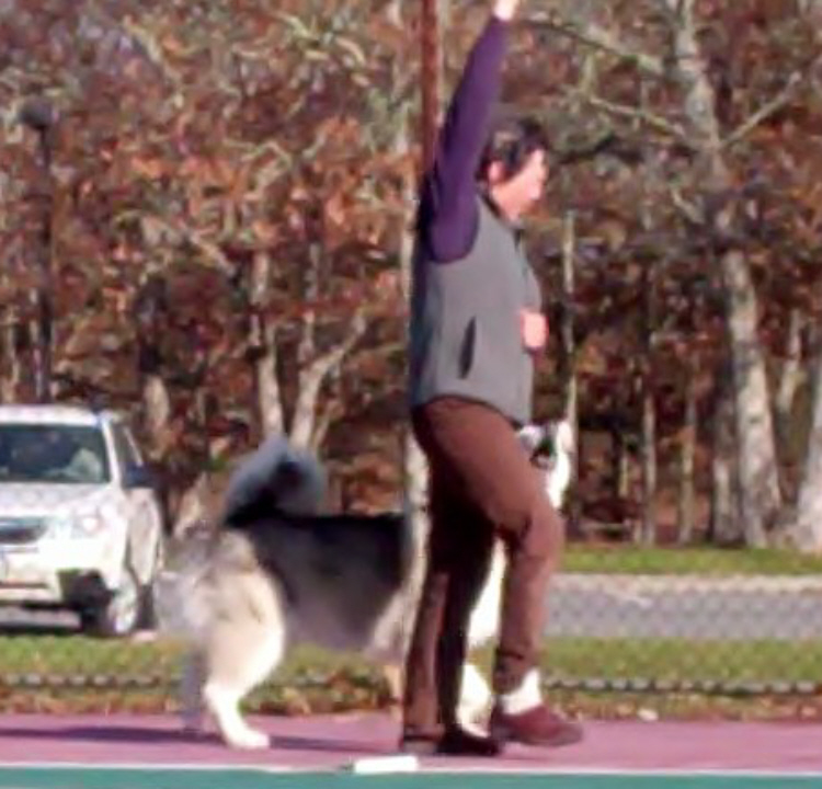 So Sunday Karen Ogden, Katy Upson, and I Rallied (so to speak) at the West Tisbury tennis court to do our thing. We were, of course, accompanied by Nolan (Australian shepherd), Dundee (Scottie), and Travvy (Alaskan malamute), respectively. Karen is the proprietor of Positive Rewards Dog Training, where Katy and I both train. We managed to get some good runs in before a nice fellow and his daughter showed up to play tennis.