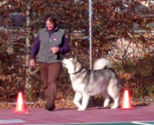 Rally — the “O” stands for Obedience — is the dog sport that Travvy and I have been competing in. To horse people I describe it as “dressage for dogs.” Dog-and-handler teams complete a course of from 12 to 20 stations, depending on the level, each of which requires the team to perform a different exercise. The exercises range from very simple — “Halt. Sit.” or “Left Turn” — to fairly complex, like “Call Front, Finish Right” and “Sit, Stand, Walk Around Dog.” Having finished our APDT Level 2 title, we’re now learning the advanced exercises required at Level 3, like “Drop on Recall” (you call the dog to you from a distance then signal him to lie down when he’s halfway there) and “Retrieve” (not an inbred skill for most Alaskan malamutes).