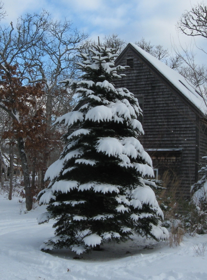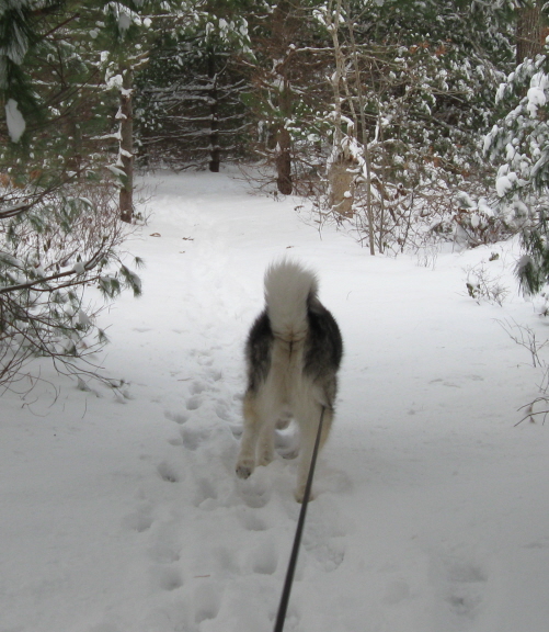 This morning Travvy and I struck out for our morning walk with about four inches of snow on the ground. Snow-walking reminds you of muscles you’d forgotten you had: it’s tough on the calves, like walking in loose sand. Every winter at least once I wish I had cross-country skis and the ability to use them. I also fantasize being towed across the snow by my four-paw-power housemate, even though I’d probably end up nose-to-bark with a tree when he took off after a rabbit.