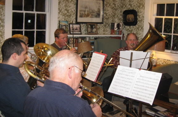As it turns out, members of Vineyard Classic Brass wanted to attend, but they usually rehearse on Wednesday nights. Rehearse at my house! said Cynthia, and so they did — in the cozy front room where my writers’ group (from which I’m currently on blogging leave) usually meets. You’d think that much brass would blow the windows out of a small room, but it didn’t. They sounded great.