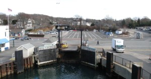 I’ll take a shot at the question of whether you’re coming or going on the ferry. Looks to me like you’re going because there are no vehicles waiting to board, the terminal looks empty, and there is a lone Steamship Authority employee who seems to be walking away from the ramp (to the right) after the ferry departed.