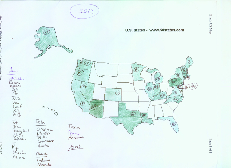 Gulp. March is gone. It was a pretty good month for license-plate spotting, though I’m still wondering where the hell Ohio is: Indiana, Nevada, Texas, Pennsylvania, and Arizona are now accounted for. Here’s what the map looked like at midnight, March 31: