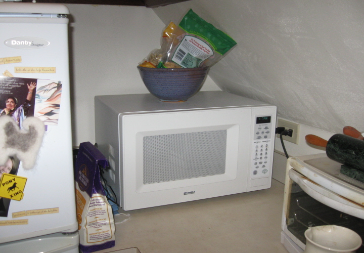 A week or so ago I was visiting with my friend Shirley, who recently moved to a new house. She was looking forward to the arrival of her new microwave, not least because it would be installed above her conventional oven and thus free up the counter space currently occupied by her old microwave. She said I could have the old one if I wanted it. You bet I did.