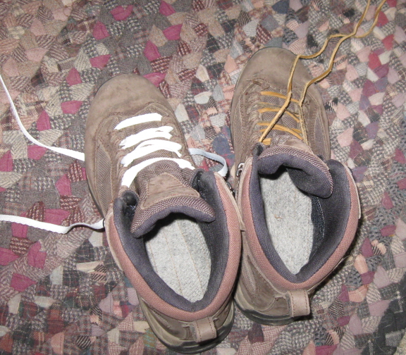 A few weeks ago the lace on one of my lightweight hiking boots, the ones I wear on my long morning walks with Travvy, started to come apart: the woven exterior peeled back from the core, making it hard to tie. The tying got harder and harder. 72-inch laces aren’t all that easy to find (surprising, considering how many people around here, male and female, wear work boots and hiking boots), and the selection was limited to rawhide, rawhide, and rawhide. I don’t like rawhide, but hey, necessity is the mother of settling for less, so I bought a pair. One snapped the first time I tightened them up. I knotted it and carried on. Within the week it had broken again. I made another knot. Did I say I don’t like rawhide laces?