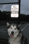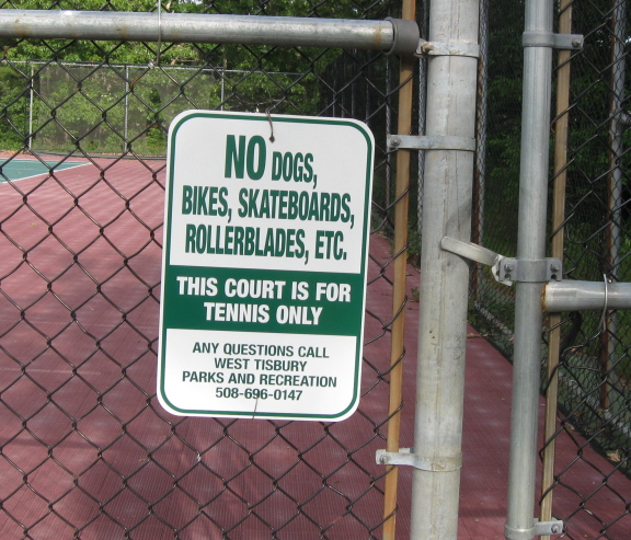 Since I’ve yet to see anyone biking, skateboarding, or rollerblading on the tennis court, and Trav is the only dog I’ve seen there in months, I assume that the sign’s primary purpose is to keep me from training Trav on the tennis court.