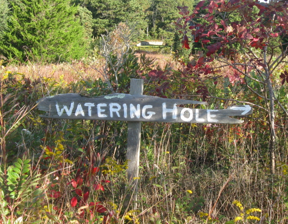A landmark for all who walk this way. Yes, the arrow does point to a dog’s water bowl and faucet at the edge of the householders’ lawn. Our walks rarely take more than an hour, and they’re never in the heat of the day, so we don’t take advantage of the watering hole — but I’m glad to know it’s there. When the householders are out gardening or doing yardwork or sitting on their patio, we call greetings to them from the trail.