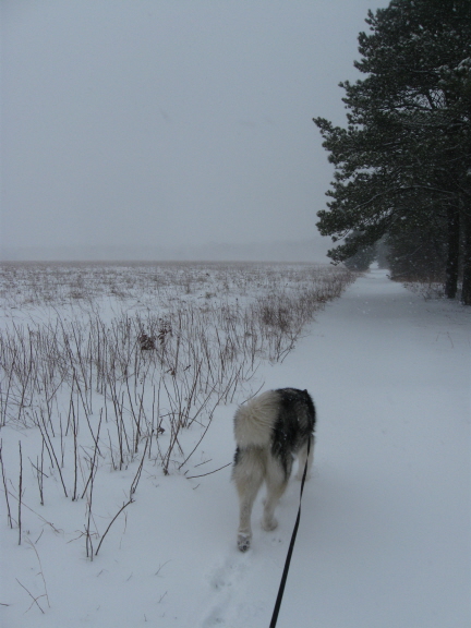 Travvy likes running in the snow. He also likes sleeping on my bed. The late Rhodry Malamutt liked to sleep curled up outside in the falling snow. After a while he’d look like a powdered-sugar doughnut. Travvy sticks his nose out the door. If snow is falling or wind is blowing, he backs up and finds somewhere dry to sleep.