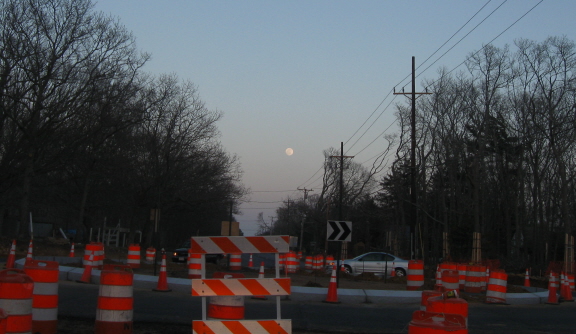 I went down to the crossroad again last night. It’s not a crossroad anymore. “A Crossroad Orange” is now a Counterclockwise Orange. An almost-full moon was rising in the east. Vehicles were feeling their way around the circle. Two bicyclists, one of whom I knew, rode around it twice. They claimed they were looking for a way out.