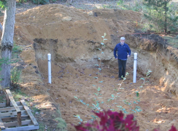 Before the hole can be filled in, the town’s health agent has to inspect the new system and give his approval. Here John Powers checks out the dimensions of the distribution area. Note relative size of person and pit.