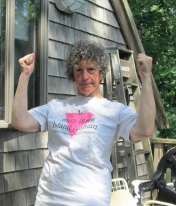 The other one was bold and blatant. NO MAN IS AN ISLAND LESBIAN, it read, across a pink triangle, and then, in smaller print underneath, and Gay Association of Martha’s Vineyard. This one I wore mostly off-island because, no matter how bold and blatant you are, at some point you get sick of noticing people trying to pretend they aren’t staring at you.