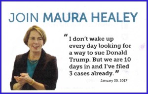 During the best of the speeches –for me these were the ones given by our two senators, Elizabeth Warren and Ed Markey, and by state attorney general Maura Healey, but some of the others were pretty good too — I felt inspired and motivated: We really can pull together, fight back against the unrolling fiasco that is the current administration, and maybe even take back Congress in 2018!