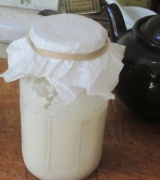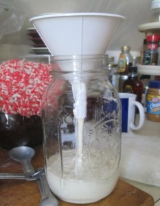 My sourdough starter resides in a mason jar in my fridge. Before I make bread, I double it: pour the contents of the jar into my big bread bowl, whisk in about a cup of warm water and about a cup and a half of unbleached white flour, then leave it out all night to ferment. In the morning, a cup goes back into the mason jar and the rest stays in the bowl to raise the loaves-to-be.