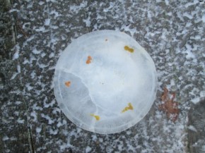 Ice disks? you ask. What are ice disks? For an intro to ice disks, see “Ice in August.” The short version is that in January 2012 I discovered that, when unmolded, the ice that formed in Travvy’s outside water dish was rather pretty. It wasn’t till the following fall that I got serious about it. It’s been a major winter amusement of mine ever since.