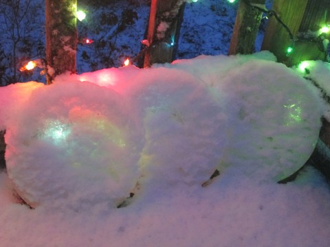 . . . and when they’re melting. This and the one just above are both from February 4. The broken one above is the one on the right in the photo below, which was taken that morning. By nightfall the one on the left was a mere dampness on the deck.