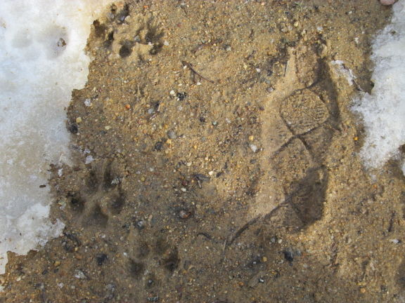 Yaktrax (mine) and pawprints (Travvy’s) in mud