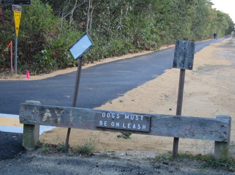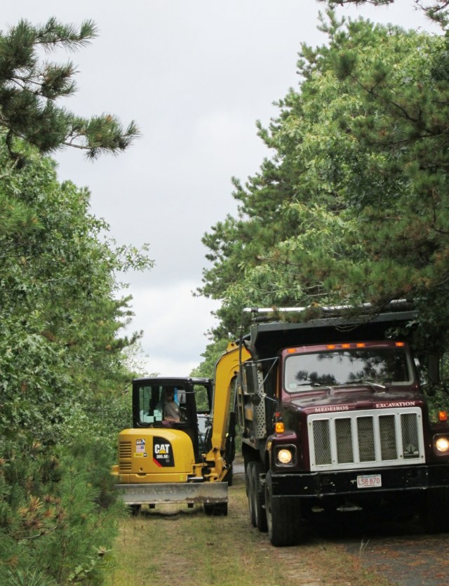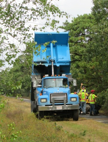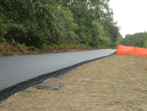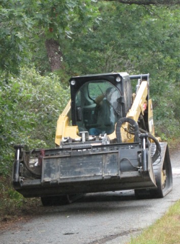 Finally this fall the whole thing was resurfaced. Since Travvy, my malamute sidekick, and I walk along the stretch of the bike path between Misty Meadows and the West Tisbury School at least once a day, I took pictures of the project as it progressed. Some days Trav got to woo at the backhoes, graders, dump trucks, pickups, and other vehicles involved in the project. Quite a few of the workers paused to greet him in return.