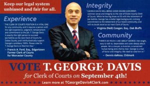 Coming closer to home — to the County of Dukes County, to be specific — T. George Davis is superbly qualified for the many-faceted job of clerk of courts, which is why I’ve been supporting him ever since he threw his hat in the ring. He handily turned back a strong primary challenge. His independent challenger in the general election has no legal experience to speak of and seems to think it’s not necessary. Just about everyone I’ve talked with disagrees.