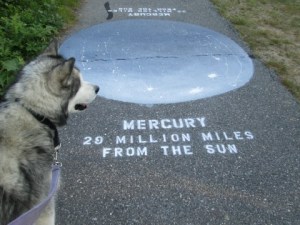 A couple of days later we set out to investigate the inner planets. Wow! Serious progress has been made. They’re probably not finished, but they’re well on the way. So far there’s no sign of the sun. Last time the sun was a fiery circle of red, orange, and yellow. Space constraints made it not much bigger than the planets (each of which has the diameter of the bike path). If it had been closer to scale, it would have taken up the whole trailhead, and the parking area would have been unavailable till the paint dried.