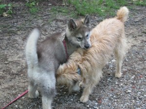 Recently Tam got to play with an adult dog who’s actually a little bigger than he is. They did fine. I’m hoping this continues as Tam moves into adolescence. Travvy learned to be OK with other dogs but he wasn’t all that comfortable with them. When he was Tam’s age, I was heavily involved with horses so he didn’t get nearly as much socialization attention as Tam is getting. Trav taught me so much, and one of the big lessons is that it’s good to start early.