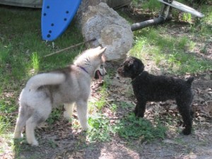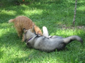 Zena was never comfortable with Travvy, maybe because when she arrived as a very small puppy, he was already full-grown and a little overbearing. With Tam, she didn’t hesitate to put him in his place when he got obnoxious, and he learned when enough was enough. She doesn’t always want to play, but when she does, they’re a hoot to watch. She’s fast, compact, and handy. He’s growing and ungainly and sometimes falls over when trying to make a tight turn.