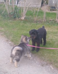 So far Tam has been really good with other dogs, most of whom are smaller than he is — though in a couple of cases this was not true when they first met. When Tam met Zena, the eight-year-old schnoodle next door, she was the big one. Six weeks later, this was no longer the case.