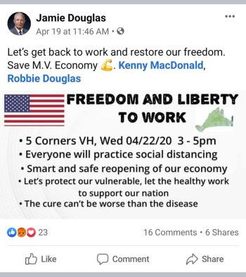 Then the Times updated its story to say that the rally was on again. The Douglases stepped back and Kenny MacDonald and Ben Ferry became the rally spokesmen. MacDonald was not new to the effort. Not only is he tagged in Jamie Douglas’s April 19 Facebook post, on Tuesday morning, April 21, he emailed his Statement to Town Governments to Edgartown administrator James Hagerty, who forwarded it to the administrators of the other five island towns. Its opening paragraph concludes: “However, the state and local governments’ usurpation of power during this crisis has alarmed me enough to act. I will be organizing a small peaceful demonstration on Martha’s Vineyard this Wednesday, April 22.”