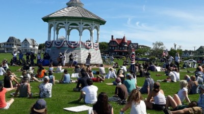 Part of the (sort of) socially distanced crowd listens to speakers at the gazebo.
