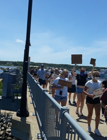 The gaps in the line can’t be readily explained by social distancing; more, it’s that we move forward at different speeds, and the participants included small children, smaller kids in strollers, and plenty of grownups who chatted as well as chanted while they walked.