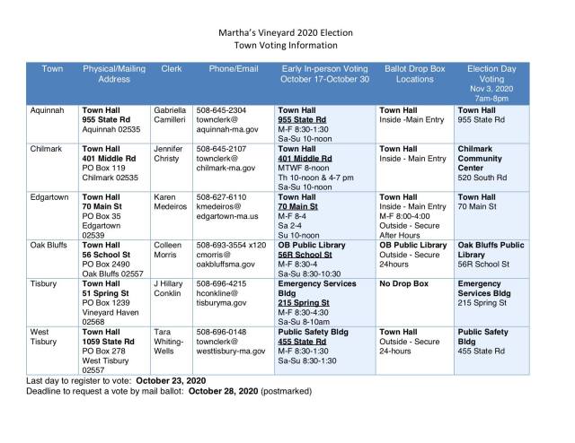 Early voting is Saturday, October 17, through Friday, October 30. Check with your local election official (in all Vineyard towns it’s the town clerk; see the chart below) for location and hours.