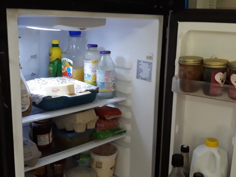 After sponging up the spilt juice, I decided the time had come to adjust the top shelf. In a big kitchen this would be easy, but — close quarters, remember? Thanks to the adjacent counter and cupboard, the refrigerator door can’t open more than 90 degrees, and that’s not enough to slide the shelf out. So I wriggled the fridge out of its almost form-fitting enclosure and turned it far enough to the left that the door swung wide enough open to let me move the shelf to the next-lower slot. Then I wriggled the fridge back into place. The orange juice bottle now stands upright. No more spilling.