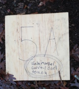 Maybe part of a science experiment? I speculated. In the late fall of 2014, little red flags just off this same trail alerted me to the presence of signs on the ground marking a grid. Turned out the students were doing a “salamander survey”: I blogged about it in “Sign of the Salamander.”