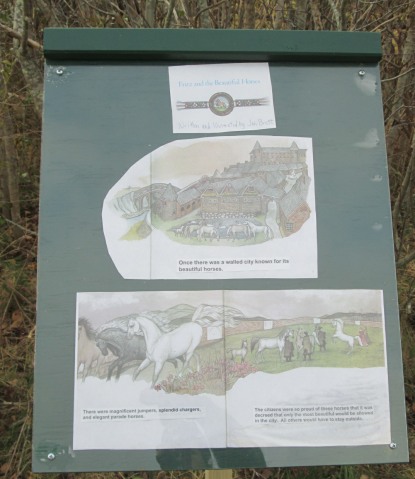 Not long afterward, another story walk appeared on my usual morning route, along the dirt track at the edge of the Nat’s Farm field, just off Old County Road. Though at least half a mile from the school, this walk also featured a kids’ book: Fritz and the Beautiful Horses, written and illustrated by Jan Brett. Nearly all the walkers, joggers, and cyclists I see in this area are grown-ups, but the choice was not surprising: adjacent to this field is the former Misty Meadows horse farm, now Misty Meadows Equine Learning Center.