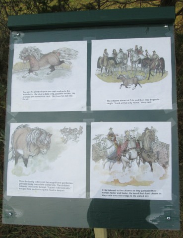 Of course I read the story, station by station, with my canine companion wondering why I was stopping so often. Fritz, it turned out, is an adorable, shaggy, Shetland-type pony. The “beautiful horses” live in a walled city whose citizens don’t allow non-beautiful horses inside the gates. Fritz has to live outside. When he tries to get their attention by emulating the beautiful horses, the citizens laugh at him.