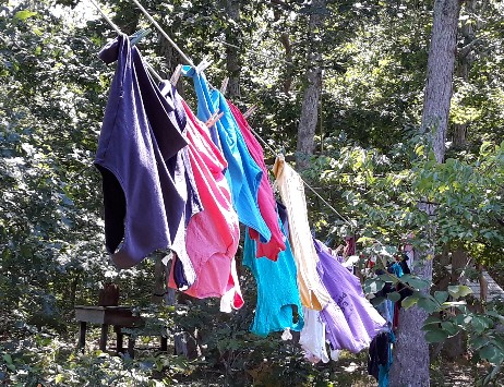 Summer laundry is a lot more colorful than cool-weather laundry, and the wind kept it moving. Socks and underwear dry on a rack up on my deck, and the undies kept flying off. I’m not complaining, however, because everything dried almost as fast as it would have in a dryer.