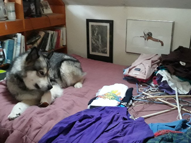 Here you see why the beautiful quilt spends much of its time obscured by a 30-year-old comforter that is showing its age but still does the job. Those are warm-weather clothes at the back, the hangers they hung on in the middle, and, in the front, a glimpse of the flannels and other cold-weather shirts that are about to take their place in the closet. Tam’s cold-weather clothing is entirely home-grown.