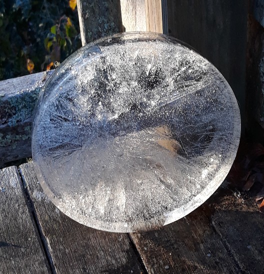 Just in time: Monday night’s temperatures produced the first ice disk of the season, which is to say the water in Tam’s outside water dish froze solid enough to be unmolded and stand up on its own.