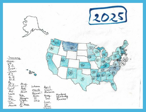 Good haul in June — Louisiana, Wisconsin, Tennessee, Montana, Kentucky, and Kansas — bringing the year-to-date total to 36, but I’m getting this one up PDQ because on the first of July I spotted one of the rare ones. See the state that’s just south of Montana and northeast of Utah? That one.