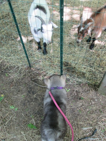 Not long after Tam’s arrival on the Vineyard, we went to visit my friend the mystery writer Cynthia Riggs. Cynthia wanted to meet the puppy — she met Travvy for the first time when he was about nine weeks old — and I wanted Tam to meet Cynthia’s menagerie, which includes goats, ducks, guinea hens, and chickens. Need I say that many photos were taken, not only by me and Cynthia but by Lynn Christoffers, a bona fide photographer who showed up at the right moment.
